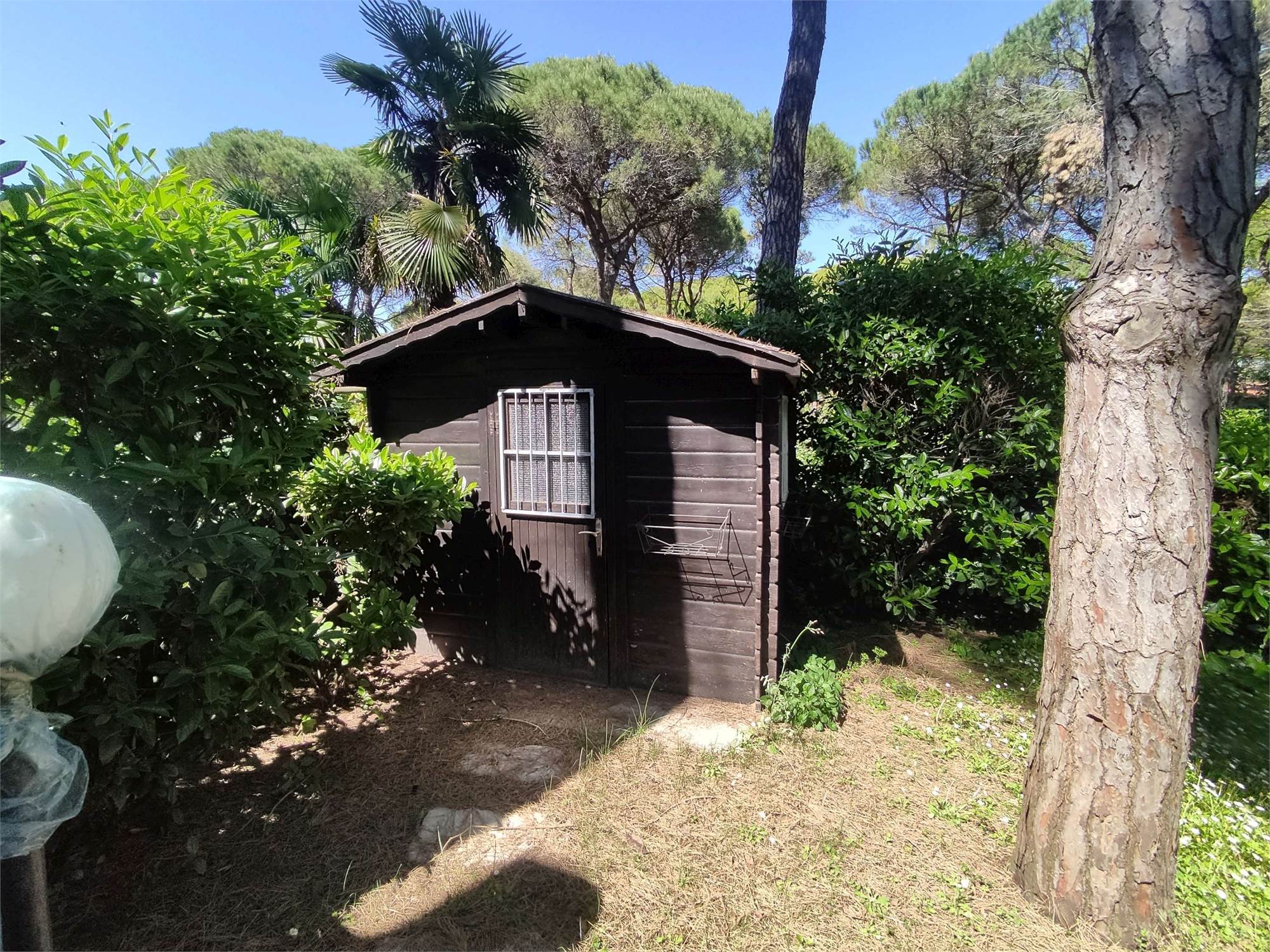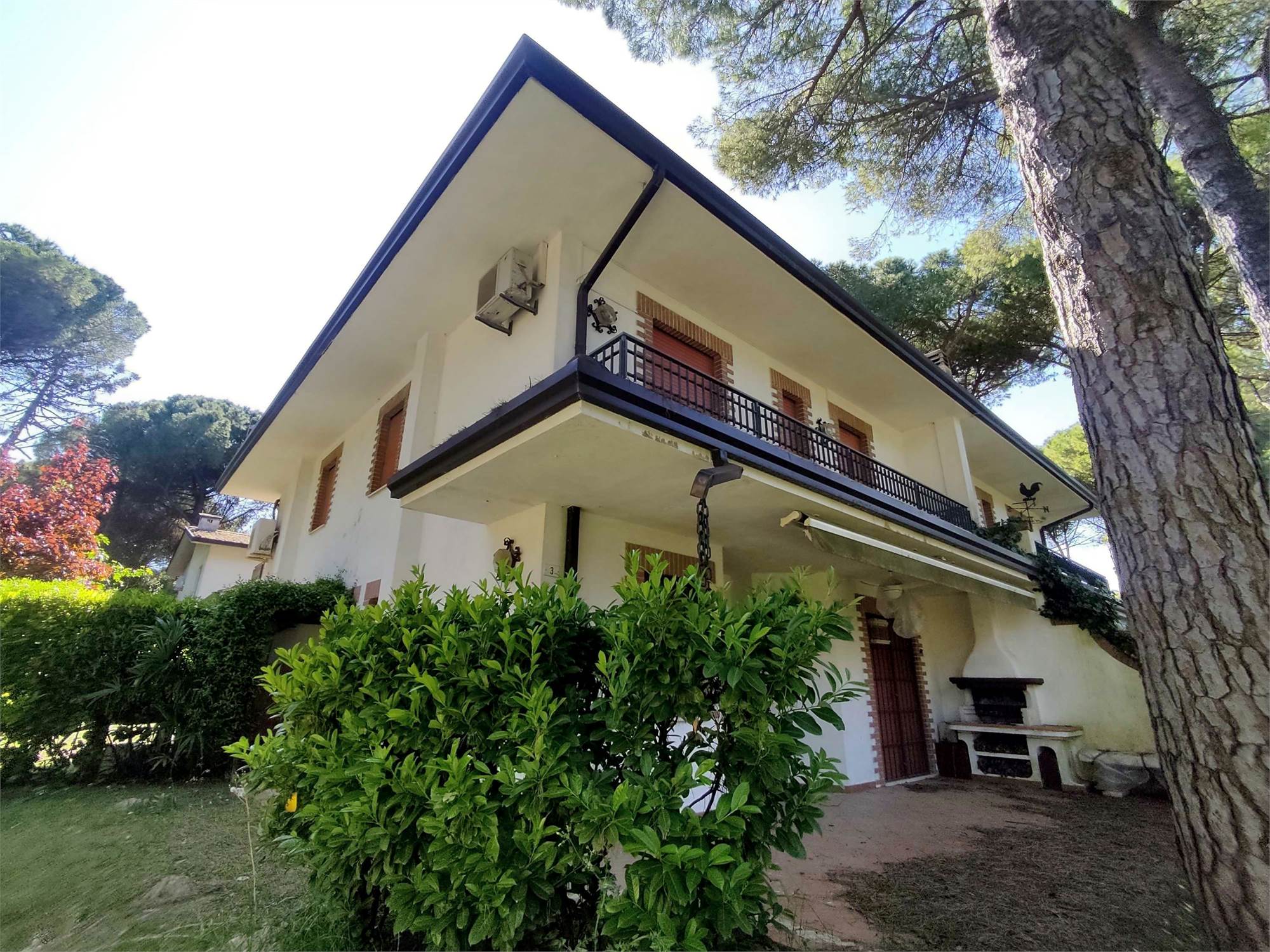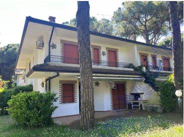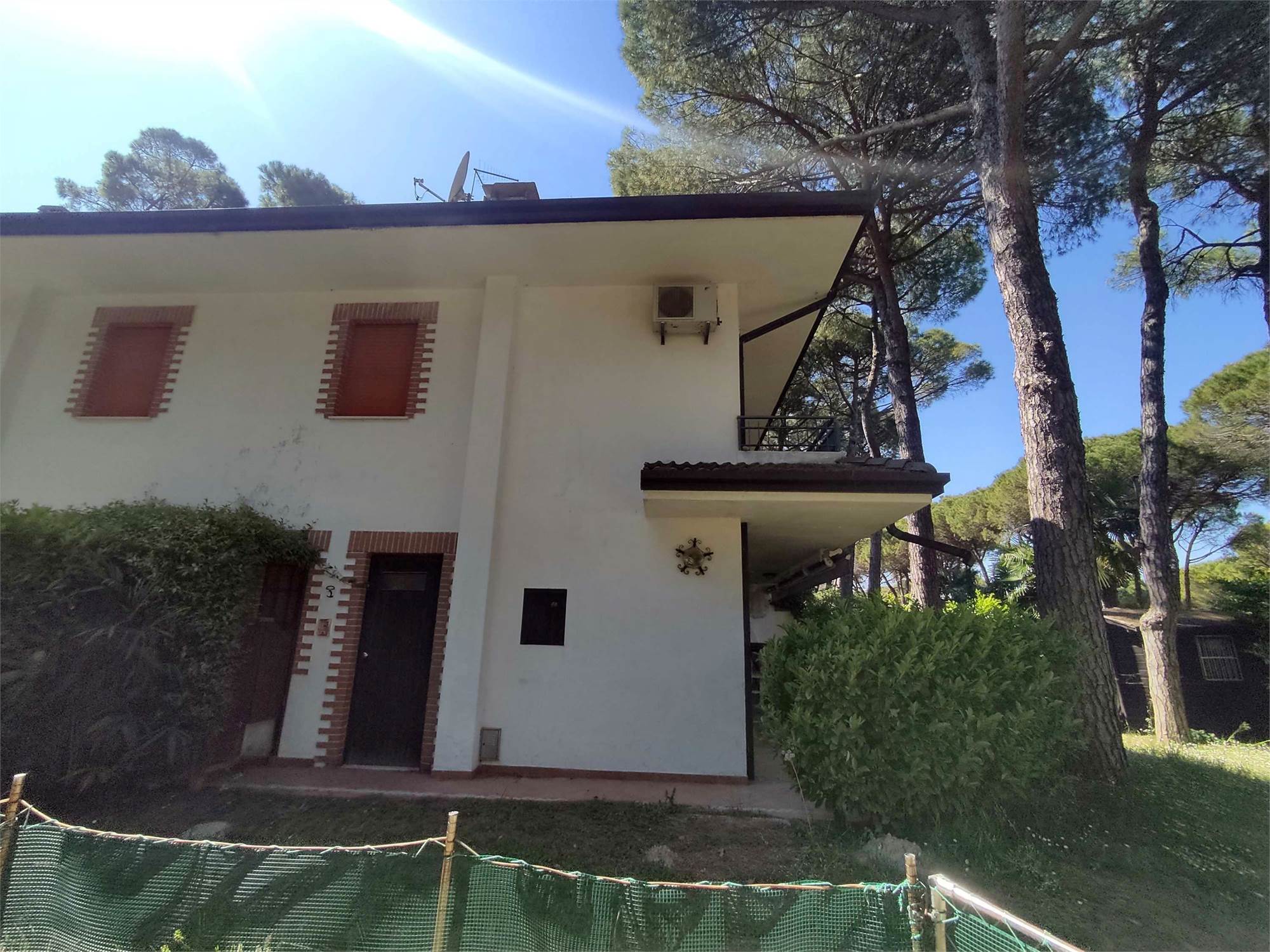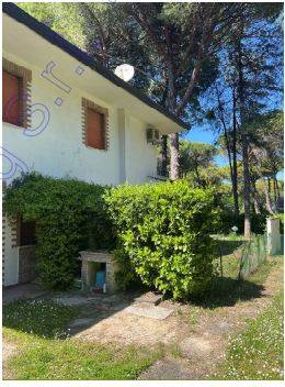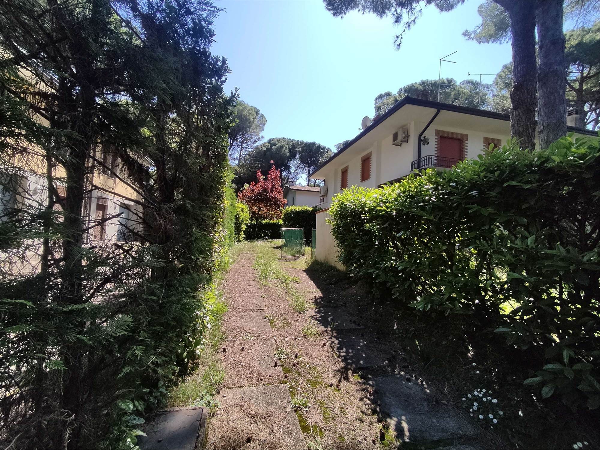 Lo spazio esterno interamente dedicato a giardino (verde), risulta recintato sui vari fronti da siepi di lauro, insistono alcuni pini marittimi che provvedono ad ombreggiare l'abitazione.