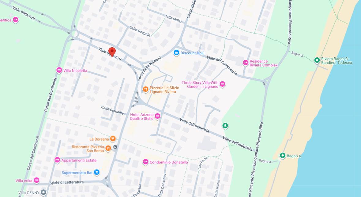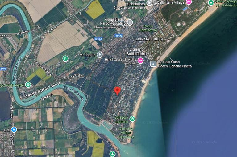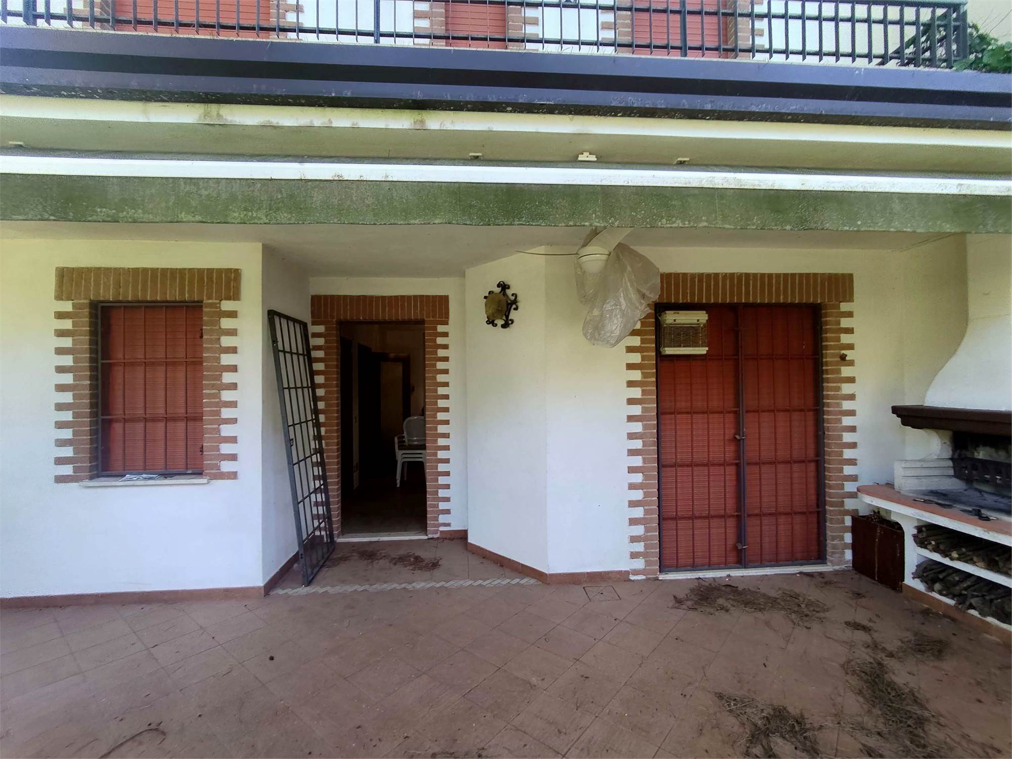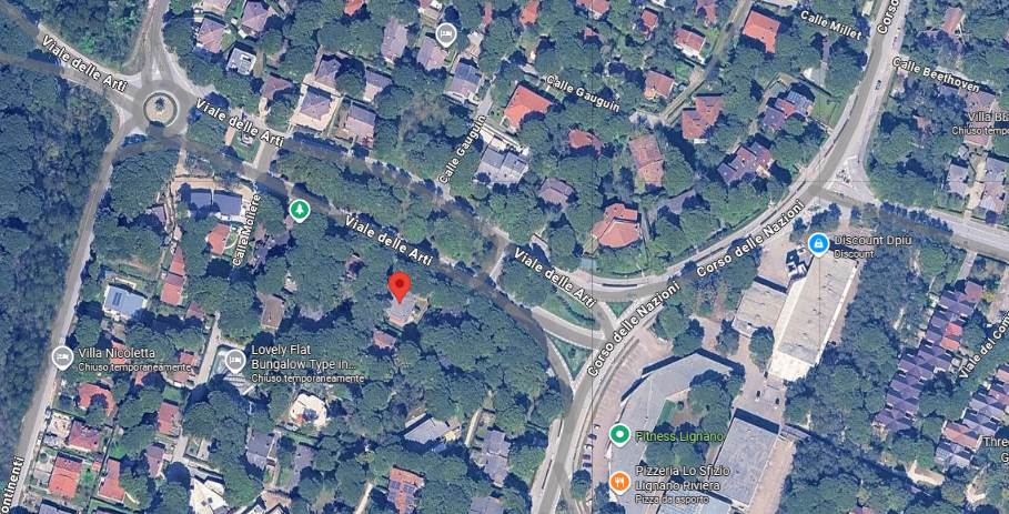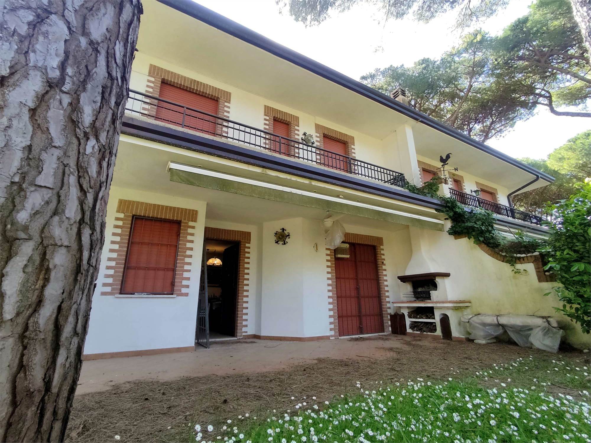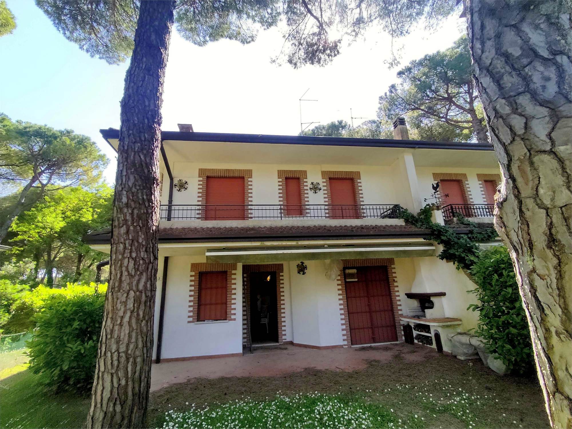 Lo spazio esterno interamente dedicato a giardino (verde), risulta recintato sui vari fronti da siepi di lauro, insistono alcuni pini marittimi che provvedono ad ombreggiare l'abitazione.