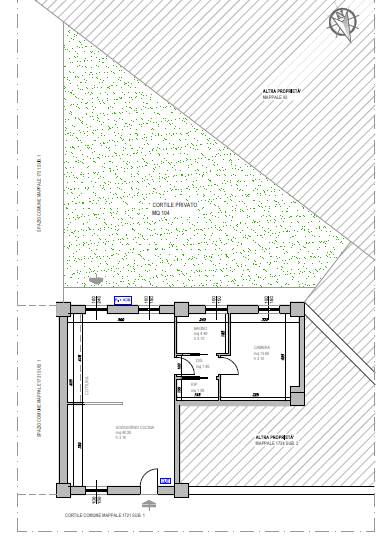 L’accesso all’appartamento avviene dal cortile comune tramite un portoncino blindato con pannellatura esterna in legno colore marrone ed interno in colore bianco; l’ingresso avviene direttamente sul soggiorno con zona cottura, vano diviso in due porzioni da un muretto in mattoni intonacato e tinteggiato in colore bianco. Un piccolo disimpegno divide gli spazi sul servizio igienico, su un piccolo ripostiglio e sulla camera da letto.