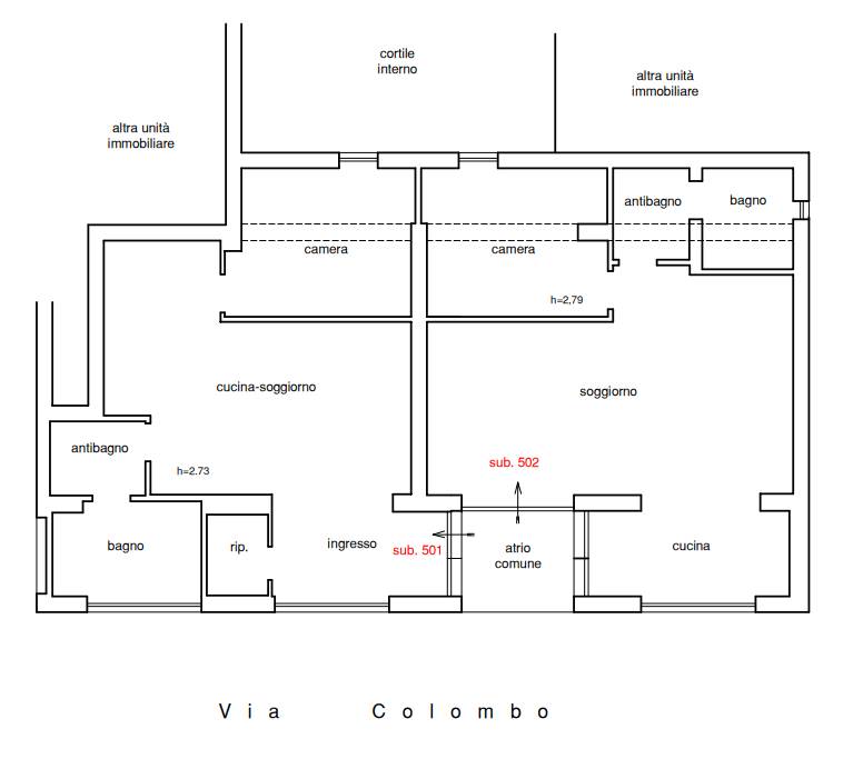 composte da: ingresso, cucina-soggiorno, camera, bagno e antibagno; l’accesso avviene direttamente dalla via colombo attraverso atrio comune con altra unità.