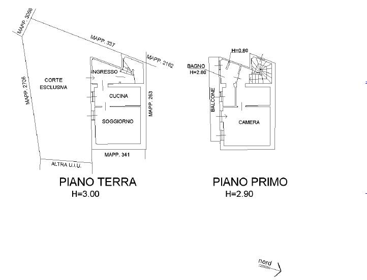 - al piano primo da: disimpegno (c.a. 7,00 mq), camera (c.a. 15,00 mq) e bagno (c.a. 5,00 mq).