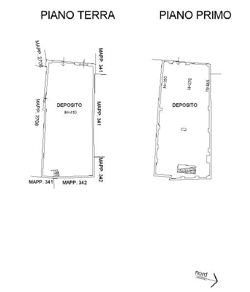 L’unità ad uso deposito è divisa in: locale a piano terra di c.a. 47,00 mq netti ed un locale a piano primo di c.a. 50,50 mq netti.
