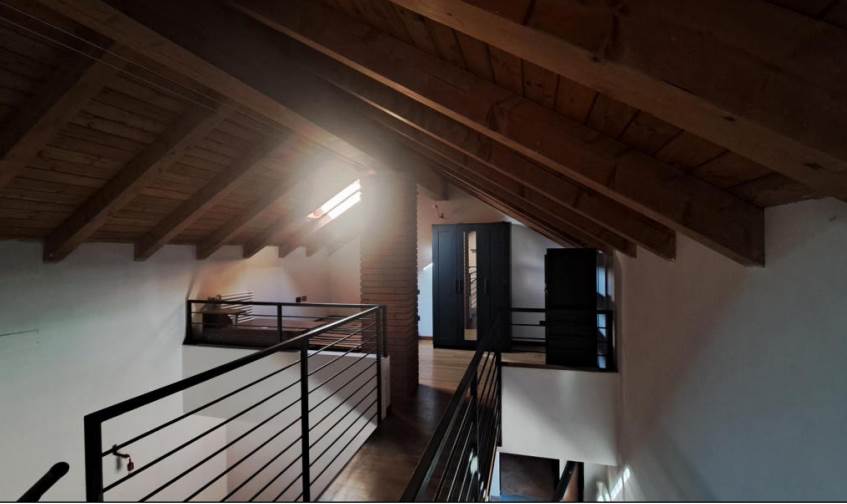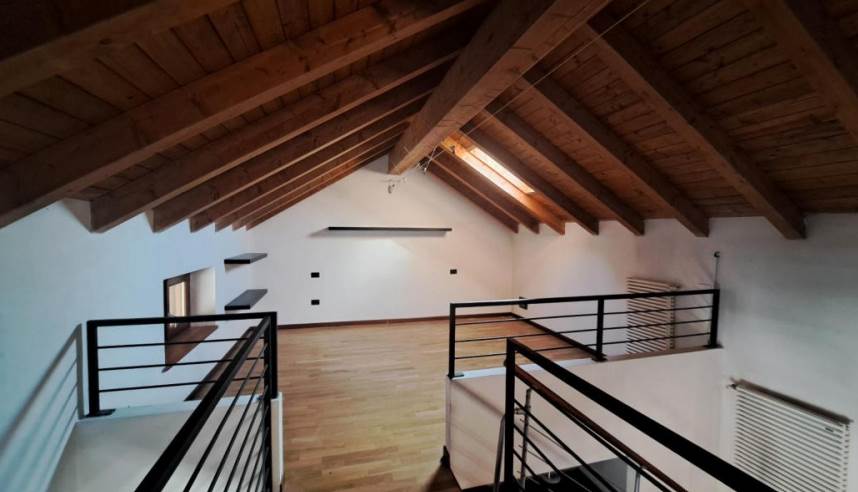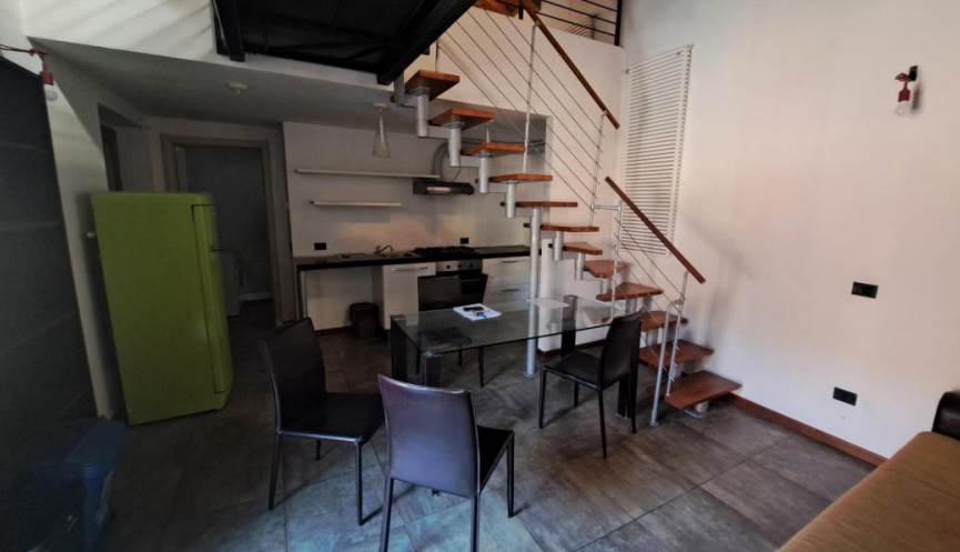 Abitazione di tipo civile su due piani situata ai piani primo e secondo (sottotetto) composta da monolocale con angolo cottura, bagno e disimpegno al piano inferiore e due ripostigli aperti sul monolocale nel sottotetto. Il collegamento fra i due livelli è assicurato da scala interna aperta. L'alloggio è dotato di due balconi sul lato Est. Posto auto scoperto situato a lato dell’area comune