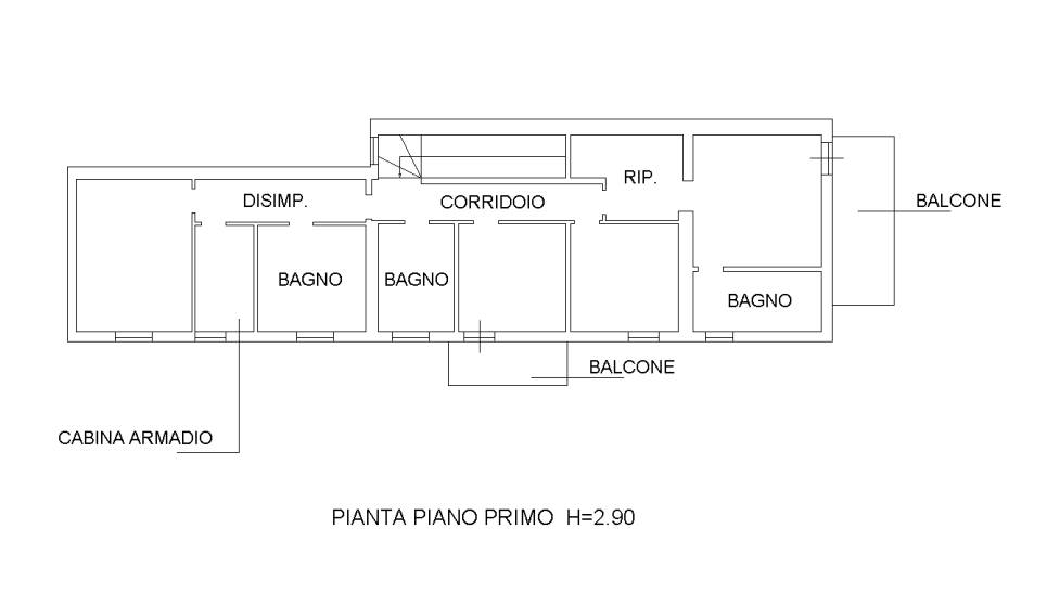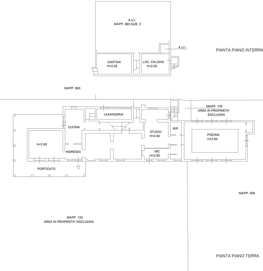 Villa su due piani composta al piano terra da un ingresso, soggiorno, cucina, pranzo, tinello, studio, bagno, piscina, lavanderia e portico; al primo piano da corridoio/disimpegno, quattro camere, cabina armadio, tre bagni, ripostiglio e due balconi; nonché da una cantina e un locale caldaia al piano interrato e da un’area di proprietà esclusiva esterna il tutto per una superficie complessiva lorda di circa 1.524,97 mq. e commerciale di circa 524,54 mq.
