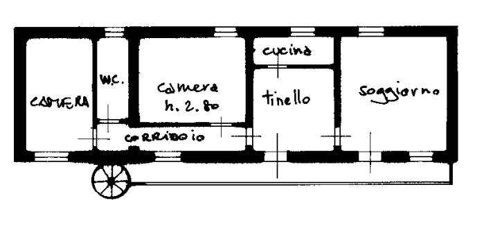 -al piano primo composto da soggiorno, cucina, corridoio, bagno, due camere, balcone, scala esterna a chiocciola ed area pertinenziale